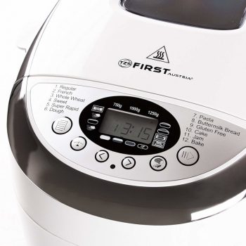 Με τον αρτοπαρασκευαστή FA-5152-5 της First Austria το ψήσιμο μυρωδάτου ψωμιού στο σπίτι γίνεται παιχνίδι! Η συμπαγής μηχανή παρασκευής με τους δύο γάντζους ζύμης, ψήνει ψωμί και κέικ σε χρόνο μηδέν και διατηρεί το ψωμί σας στην τέλεια θερμοκρασία χάρη στη λειτουργία διατήρησης της θερμοκρασίας. Απλώς τοποθετήστε τα υλικά στο αντικολλητικό ταψί και επιλέξτε το πρόγραμμα και το επίπεδο ροδίσματος που επιθυμείτε. Διαθέτει 14 αυτόματα προγράμματα με δύο μεγέθη ψωμιού και 3 επίπεδα ροδίσματος, για όλα τα είδη αλευριού και για κάθε γούστο. Η συσκευή είναι εύχρηστη με λειτουργίες αυτόματης απενεργοποίησης και χρονοδιακόπτη καθυστέρησης, ενώ υπάρχει ενσωματωμένη θήκη για ξηρούς καρπούς, ώστε να γίνουν το ψωμί, το κέικ ή η πίτσα ακόμα πιο νόστιμα. Περιλαμβάνει έναν επιπλέον γάντζο για αφαίρεση της λεπίδας ζυμώματος, ένα δοσομετρικό κουτάλι και μία μεζούρα, για να είστε πάντα ακριβείς στη συνταγή σας.